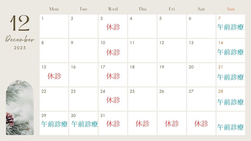 12月 休診日のお知らせ 2025-11-25 最終更新日時 : 2025-11-25 伊勢宮どうぶつ病院 12月15日(月)臨時休診 12月30日(火)午前診察のみ 12月29日(月)午前診察のみ 12月31日〜1月3日 休診 水曜・祝日、日曜午後は休診日です